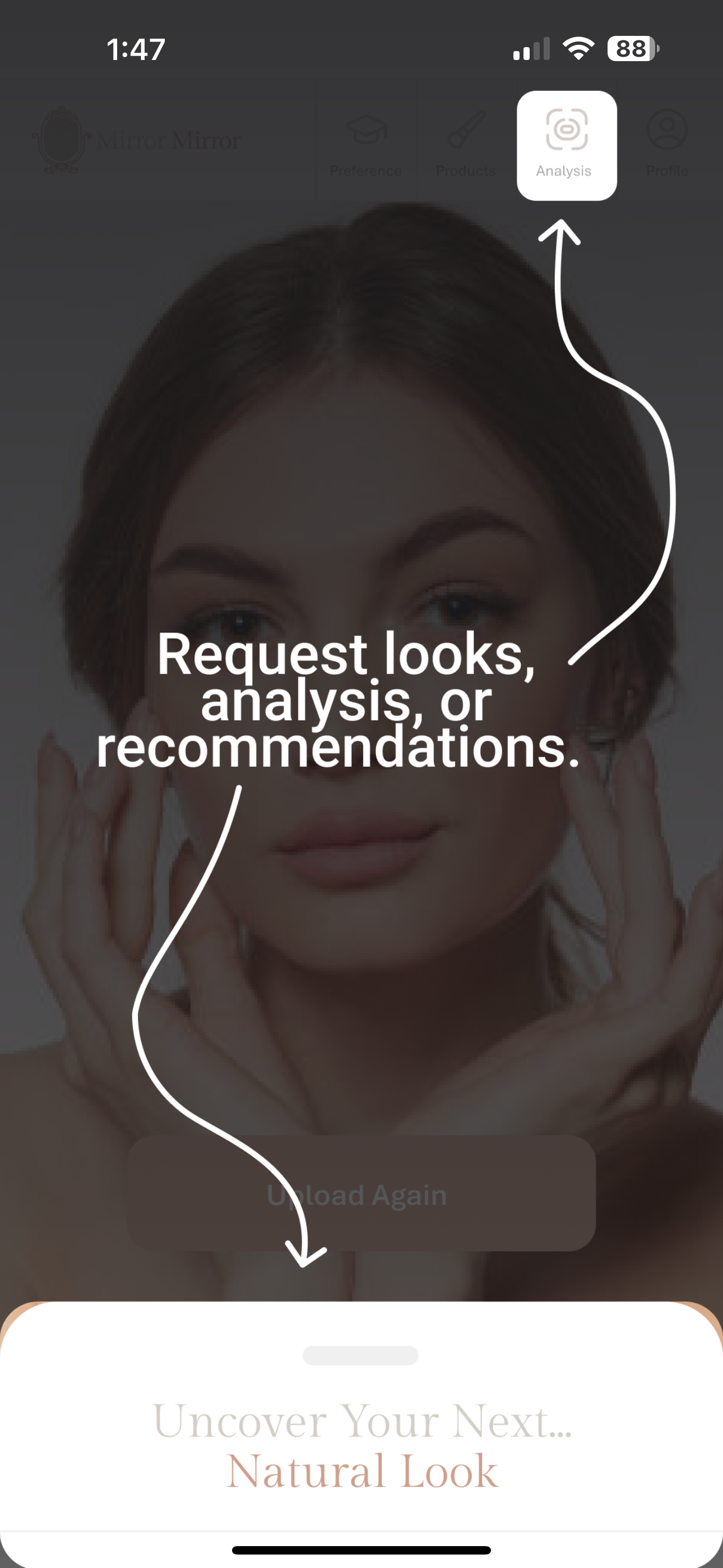 Snap a selfie and let Mirror Mirror analyze your features to recommend the perfect care routine and makeup products. Our advanced facial analysis transforms your natural beauty into personalized recommendations.